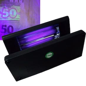A lâmpada UV fluorescente azul de 4W, permite que as marcas d'água sejam facilmente identificadas em segundos e quaisquer outras marcas distintas presentes no dinheiro. Ideal para comércios em geral, evite o recebimento de Cédulas Falsas, muito mais segurança para o seu negócio. Verifique as marcas de segurança em segundos Características do produto: Detectar marcas invisíveis, impressões digitais, dinheiro falso, cartões de crédito e etcSem transformador ou motor de arranquePotência: 4WBotão Liga/DesligaCor: PretoÓtima qualidade e durabilidadeFácil ManuseioLuz UVAlimentação: Fonte 110v Medidas do Produto: Comprimento: 18 cmAltura: 9 cmLargura: 8 cmPeso: 350gr. Obs: Imagens Meramente Ilustrativas3 meses de garantia contra defeitos de fabricação.400gr.