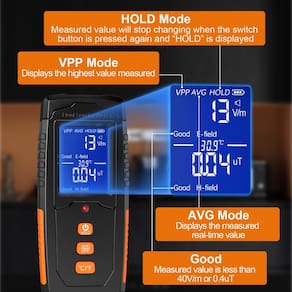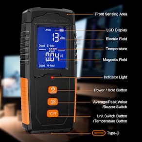 1. **Medição precisa** para fornecer dados precisos sobre os níveis de campo eletromagnético. 2. **Versatilidade** em ser capaz de medir em várias configurações. 3. **Interface amigável** para fácil operação e compreensão dos resultados. 4. **Confiabilidade** em fornecer leituras precisas de forma consistente. 5. **Design compacto e portátil** para uso conveniente em qualquer lugar. - ?Medição precisa para fornecer dados precisos sobre os níveis de campo eletromagnético?O detector de medidor EMF tem sensor de radiação eletromagnética embutido, que pode exibir o valor da radiação em um visor digital LCD transparente controlando o microchip. Unidades opcionais mG/µT para testar radiação de campo magnético, V/m para testar campo elétrico. - ?Alarme de luz sonora?Quando o valor do campo elétrico excede 40 V/m, e o campo magnético excede 0,4 µT ou 4 mG, a tela de LED fica vermelha, a luz indicadora pisca e a campainha alarma. Se você achar barulhento, você pode pressionar por muito tempo o botão "AVG/VPP" para desligar o som. - ?Amplamente utilizado, sendo capaz de medir em várias configurações?Os medidores EMF podem medir campos eletromagnéticos, identificar equipamentos que geram alta radiação e permitem que você tome decisões sobre limitar a exposição. Principalmente testando campos magnéticos e elétricos, como testar TVs, computadores, geladeiras, impressoras, fornos de micro-ondas, torres de celular, aparelhos de baixa frequência, caça a fantasmas, etc. - ?Múltiplas funções?Pressione rapidamente "AVG/VPP" para alternar a média de teste ou as leituras de pico, pressione rapidamente o botão "?/ASCG" para alternar as unidades de temperatura °C e °C. O detector desligará automaticamente após 5 minutos sem operação. - ?Atendimento ao cliente?Serviço pós-venda de 36 meses e suporte técnico vitalício. Se você tiver alguma dúvida, sinta-se à vontade para entrar em contato conosco, a equipe profissional de pós-venda resolverá seu problema em tempo hábil. O pacote inclui: 1 detector de radiação EMF + 1 cabo USB + manual de instruções (sem garantia de versão em português).