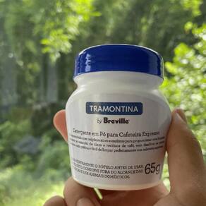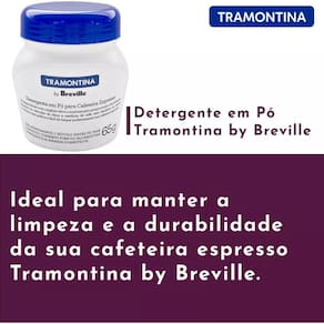 Detalhes do produto O Detergente em Pó para Cafeteira Express 65 g, é ideal para manter a limpeza e a durabilidade da sua cafeteira espresso Tramontina by Breville. Ele foi desenvolvido com oxigênio ativo e enzimas para proporcionar uma limpeza eficiente na remoção de óleos e resíduos de café, sem danificar as peças. É a forma mais prática e fácil de limpar perfeitamente sua cafeteira. Informações técnicas Foi desenvolvido com oxigênio ativo e enzimas para proporcionar uma limpeza eficiente na remoção de óleos e resíduos de café, sem danificar as peças. É a forma mais prática e fácil de limpar perfeitamente sua cafeteira expresso. Compatível com as cafeteiras expresso Tramontina by Breville. Material: detergente em pó. Contém 65g.