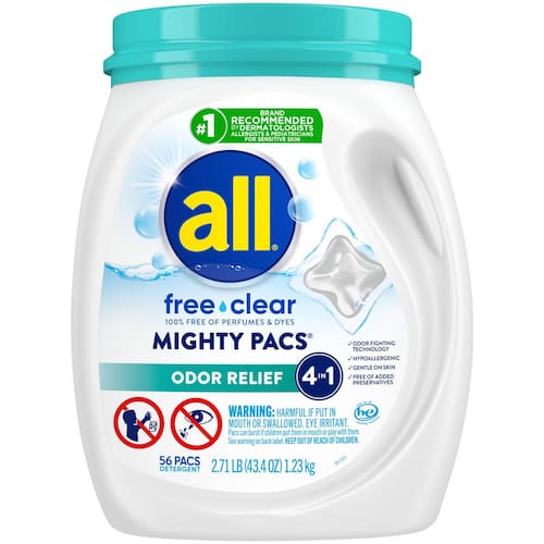 Detergente para roupa All Mighty Pacs Free Clear Odor Relief 56
