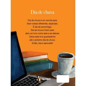 Dia de chuva é um convite para fazer coisas diferentes , especiais. É dia de aconchego. Dia de chuva é bom para abrir um livro e se deliciar. Texto e ilustrações em harmonia para destacar coisas boas que podem ser feitas em dias de chuva. Dia de chuva é dia de poesia, de literatura. Dia de aproveitar a companhia dos amigos. Dia de colocar a leitura em dia. Obra rica em elementos para a realização de trabalhos relacionados à chuva , ao clima , ao convívio familiar e outras atividades não relacionadas ao uso de equipamentos eletrônicos. São elencadas coisas simples que podem ser feitas dentro ou fora de casa, especialmente em dias de chuva. Destaque para a beleza das ilustrações que também podem ser exploradas para enriquecer a ti vidades literárias e o estímulo à leitura como instrumento de lazer. Marca: MAIS AMIGOS **