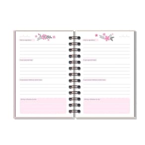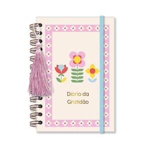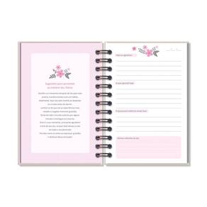 Capa dura, miolo pautado e decorado com 80 folhas em papel offset 90 g (você pode usar canetas coloridas que não passam para o outro lado), formato 11,8 cm × 17,5 cm, encadernação em wire-o.