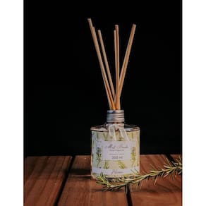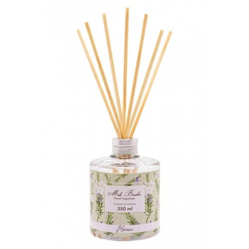 Ref.: 002254 Difusor De Aromas 350 Ml - Alecrim - Mels Brushes Aromatiza de forma contínua, as varetas de madeira são ótimos veículos para a propagação do aroma. Além disso, decora o ambiente com sofisticação e elegância. Indicados para aromatização e decoração de salas, lavabos, etc. Os Difusores de aromas incluem as varetas de madeira para evaporar a fragrância, basta remover o selo da tampa do frasco e inserir as varetas. Para aumentar a intensidade vire as varetas uma vez ao dia para uma maior liberação do aroma. A fórmula evapora ao longo do tempo e, depende da temperatura ambiente, os difusores permanecem perfumados por cerca de 90 dias. As varetas podem ser invertidas constantemente para maior aromatização. Aroma herbáceo refrescante, boscoso, aguçado e tons de cânfora. Originada no Mediterrâneo. Material: PET e madeira Família Olfativa: Floral.