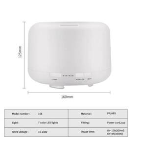 Especificacoes Tamanho do difusor 500ml: 168121mm Potencia: 13w Tensao de entrada e saida: ac100-240v dc 24 0.65mah Capacidade: 500ml Tempo de trabalho: 1h/2h/3h/em Material: pp + abs Frequencia ultra-sonica: 2.4mhz Caracteristica: iluminacao de 7 cores.