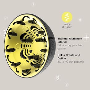 Difusor de cabelo: O difusor de cabelo Curl Collective Coily tem circulação de ar personalizada para cabelos cacheados a crespos. Seque o cabelo mais rápido com o interior de alumínio térmico enquanto reduz o frizz para obter cachos mais suaves.