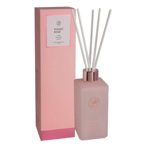O difusor de perfume sunset rosé 250ml teve seu pré-lançamento no salão de gramado em junho de 2019, sendo sucesso de vendas.Modo de usar: retire a tampa dourada e o lacre. Coloque a tampa de volta e insira as varetas para difundir o perfume. Sempre que necessário vire as varetas para melhor dispersão.Precauções: manter longe do alcance de crianças e ao abrigo da luz e calor excessivo. Não usar perto de fonte de calor. Não ingerir e nem colocar em contato com olhos e pele. Uso externo.Perfil olfativo: floral, frutado e pêra.Notas de saída: fruta, laranja, verde frondoso, verde, ozônio.Notas de corpo: floral, jasmin, lily do vale, ylang-ylang, ciclâmen.Notas de fundo: almíscar, animal, cedro, madeira, baunilha. Marca: L'Envie