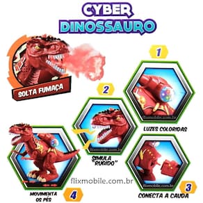 Dinossauro de Brinquedo Anda Tiranossauro Rex Som Luz e Solta Fumaça Vermelho Cyber Dinossauro Rex que Solta Fumaça com Som e Luz O Cyber Tiranossauro Rex é um hybrido Robótico com movimentos realistas, ele mexe a causa, anda, mexe as asas, acende uma luzes no corpo e na boca acende lluzes coloridas nas costas e na boca no momento em que vai soltar a fumaça, cria a magia e ilusão de estar cuspindo fogo, um arraso de brinquedo que encanta até adultos. Fumaça: A fumaça é a vaporização de agua, retire a tampa da cabeça para encher o reservatório de água. Recursos: - Anda - Emite Som - Luzes - Solta Fumaça Especificações: Modelo: Cyber Dinossauro Composição: Plástico e Metal Código do fabricante: CP098143 Idade Mínima: Á partir de 3 anos Certficado INMETRO: CE-BRI/BRICS 00137-15 NM2300/2002 Alimentação: Três pilhas AA não inclusas Itens Inclusos: 1 x Cyber Dinossauro Ean: 7899576627253