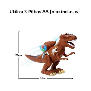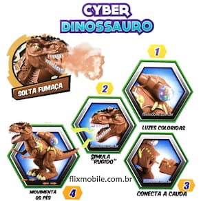 Dinossauro Cibernético Rex que Anda e Solta Fumaça Luz Som de 45cm Marrom Cyber Dinossauro Rex que Solta Fumaça com Som e Luz O Cyber Tiranossauro Rex é um hybrido Robótico com movimentos realistas, ele mexe a causa, anda, mexe as asas, acende uma luzes no corpo e na boca acende lluzes coloridas nas costas e na boca no momento em que vai soltar a fumaça, cria a magia e ilusão de estar cuspindo fogo, um arraso de brinquedo que encanta até adultos. Fumaça: A fumaça é a vaporização de agua, retire a tampa da cabeça para encher o reservatório de água. Recursos: - Anda - Emite Som - Luzes - Solta Fumaça Especificações: Modelo: Cyber Dinossauro Composição: Plástico e Metal Código do fabricante: CP098143 Idade Mínima: Á partir de 3 anos Certificado INMETRO: CE-BRI/BRICS 00137-15 NM2300/2002 Alimentação: Três pilhas AA não inclusas Itens Inclusos: 1 x Cyber Dinossauro Ean: 7899576627246