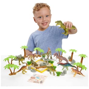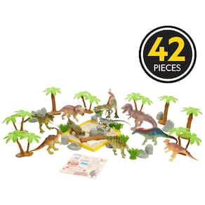 Ótimo para on the go As figuras podem ser zenadas no recipiente, que possui uma alça para facilitar o transporte. A tampa ainda apresenta uma paisagem inspirada em dinossauros que as crianças podem usar para reimaginar as aventuras do período Cretáceo.