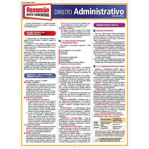 O Resumão aborda os principais conceitos do Direito administrativo com foco nos concursos públicos. Regime jurídico da administração, princípios constitucionais administrativos, administração pública, atos administrativos, licitação, contratos administrativos, concessão e permissão de serviços públicos, agentes públicos, bens públicos, improbidade administrativa e processo administrativo são os temas abordados. Há, ainda, testes resolvidos. Marca: Não Informado