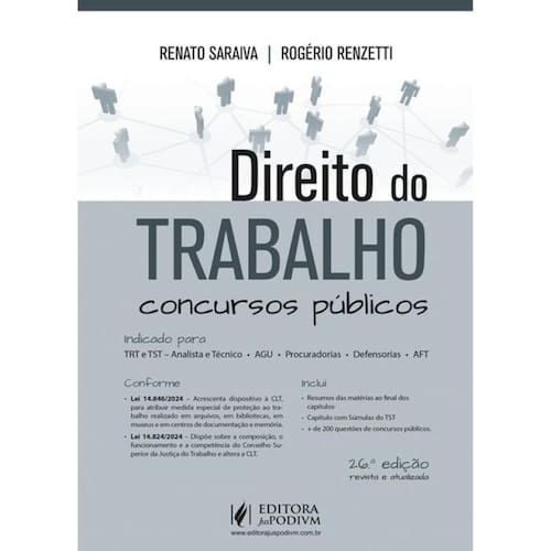 CONFORME: • Lei 14.846/2024 – Acrescenta dispositivo à CLT, para atribuir medida especial de proteção ao trabalho realizado em arquivos, em bibliotecas, em museus e em centros de documentação e memória. • Lei 14.824/2024 – Dispõe sobre a composição, o funcionamento e a competência do Conselho Superior da Justiça do Trabalho e altera a CLT. CONTÉM: • Resumos das matérias ao final dos capítulos. • Capítulo com Súmulas do TST. • + de 200 questões de concursos públicos. POR QUE ESCOLHER O LIVRO “DIREITO DO TRABALHO PARA CONCURSOS PÚBLICOS”? O presente livro tem por objetivo apresentar o Direito do Trabalho de forma abrangente, simples e clara, auxiliando a todos os estudantes na árdua tarefa que agora empreendem na realização de provas e concursos na seara trabalhista. A obra é indicada a todos aqueles que estão se preparando para a realização de provas objetivas que demandam um conteúdo programático que envolva Direito do Trabalho. Todos os capítulos foram elaborados com o escopo de permitir ao leitor um acompanhamento integral da matéria, auxiliando na interpretação da norma legal trabalhista, súmulas e orientações jurisprudenciais. Para que o leitor possa acompanhar o posicionamento das bancas examinadoras e testar seus conhecimentos, incluímos algumas questões de concursos recentes, buscando permitir um treinamento efetivo sobre o tema estudado, como forma de revisar a matéria e verificar a assimilação do conteúdo. Preocupamo-nos, em todos os institutos, com a utilização, sempre que possível, da jurisprudência, pois podemos afirmar que ela vem sendo adotada reiteradamente em provas e concursos em todos os níveis. Em temas controvertidos, a citação de outros doutrinadores não foi esquecida, trazendo ao leitor opiniões distintas de outros autores, para que o intérprete possa formar seu convencimento mediante a análise de vários posicionamentos. Enfim, o leitor encontrará uma obra completamente atualizada. Essa foi a preocupação constante ao longo das novas edições. Uma boa leitura a todos e bom estudo!