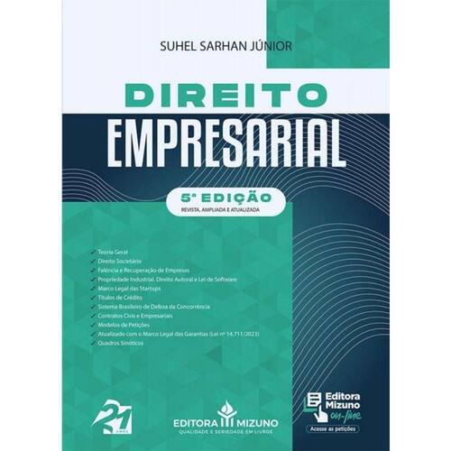 Direito Empresarial, que está em sua 5ª edição, é um livro completo sobre este ramo do Direito, que aborda todos os tópicos com escrita objetiva, vasto repertório jurisprudencial (atualizado), comparativos com legislações estrangeiras, quadros sinóticos, aprofundamento com análise de instruções normativas e resoluções, dentre outros. É importante obra que esgota o conteúdo programático para alunos de graduação e pós-graduação, bem como cumpre os editais dos principais concursos públicos e Exame de Ordem. Para os operadores do direito, é um imprescindível manual de consulta diária sobre pontos práticos, trazendo análise de decisões recentes dos tribunais brasileiros, além de conter modelos e explicações de petições. Tem como escopo atender os leitores que buscam ter conhecimento completo e objetivo sobre o Direito Empresarial. A edição de 2024 já está atualizada com as alterações impostas pela Lei nº 14.711/2023 (Marco Legal das Garantias). Marca: EDITORA MIZUNO
