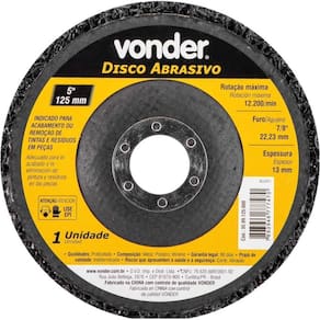 Marca: VonderConteúdo da embalagem:1 Disco abrasivo.Destaques e diferenciais:Prático e de fácil utilização. Proporciona um trabalho uniforme.Aplicações e dicas de uso:Utilizado com esmerilhadeira angular, indicado para remoção de pinturas sem que haja remoção de material na chapa de aço. Sua flexibilidade garante a remoção por completo. Principal aplicação em oficinas de repinturas.Detalhes TécnicosDiâmetro do disco pol/mm : 5 - 125 mm Espessura do disco pol/mm : 13 mm Diâmetro do furo pol/mm : 7/8 - 22,23 mm Material do disco: Carbeto de silício Rotação máxima do disco rpm : 12.200/min Massa aproximada peso kg : 0,251 kg Garantia - E CDC :Garantia legal: 90 dias