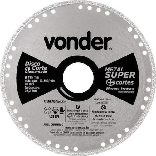 Marca:vonderconteúdo da embalagem:1 disco de corte diamantadodescrição:disco de corte diamantado, contínuo, para metais, metal super, 115 mm, vonderindicações:indicado para serralheiros e demais profissionais em geral. Ideal para cortar barras, tubos, chapas metálicas, aço carbono e aço inox. Utilizado em esmerilhadeiras. Características técnicas:categoria do multímetro: cat iii 600v diâmetro do furo do disco de corte diamantado: 22,2 mm tipo de corte do disco de corte diamantado: a seco perfil do corte: anel contínuo rotação máxima rpm : 13300 /mincodigo do forncedor:1240000115 Marca: Não Informado Ean: 7893946600662