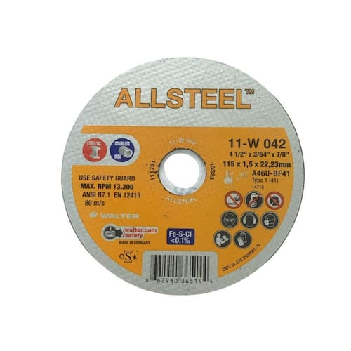 Disco De Corte Allsteel Aço E Inox 11W042 4.1/2 x 3/64 x 7/8 Walter O Disco de Corte Allsteel Aço e Inox 11W042 4.1/2 x 3/64 x 7/8 da Walter é um abrasivo de alta performance para uso em esmerilhadeiras angulares. Ele tem 4.1/2 polegadas de diâmetro aproximadamente 115mm , uma espessura de 3/64 polegadas que corresponde a cerca de 1.2mm e um furo central de 7/8 polegadas 22,2mm . Este disco da linha Allsteel da Walter é especialmente formulado para fazer cortes rápidos e precisos, com menor geração de calor e pouca rebarba. Ele é uma escolha para cortar tanto aço comum quanto aço inoxidável. Uma de suas características é ser livre de ferro, enxofre e cloro, o que é importante para evitar a contaminação do aço inoxidável e manter suas propriedades. O código 11W042 é o identificador do produto dentro da linha Walter.