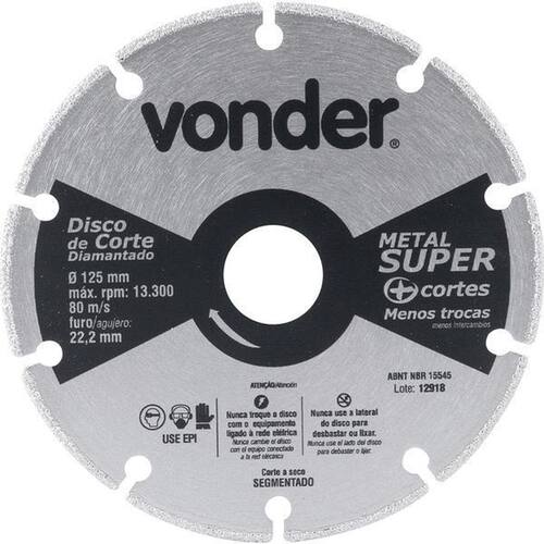 Conteúdo Embalagem: 1 Disco de corte diamantado Destaques e diferenciais: Produto de altíssima qualidade com alta performance. Comparado a um disco abrasivo convencional, pode obter um rendimento até 10 vezes superior, considerando as mesmas condições e aplicações espessura e dureza do material, temperatura ambiente, potência do equipamento, etc . Reduz o risco de acidentes por ser um disco de metal. Aplicações e dicas de uso: Indicado para cortar metais, como chapas metálicas, aço inoxidável, vergalhões, ferro fundido e metais não ferrosos. Utilizado em esmerilhadeiras. Proporciona qualidade e produtividade na operação. Características Técnicas: Diâmetro externo do disco de corte diamantado: 125 mm Diâmetro do furo do disco de corte diamantado: 22,2 mm Tipo de corte do disco de corte diamantado: A seco Perfil do corte: Segmentado Rotação máxima rpm : 12250 /min Segue norma: ABNT NBR 15545 Marca: Não Informado