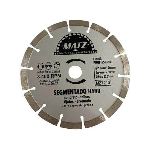Informações técnicas: Perfil do corte: Segmentado Diamantado Tipo de corte: A seco e refrigerado Dimensões: - Diâmetro externo: 180mm 7.1/4'' - Diâmetro do furo: 22,23mm 7/8'' - Acompanha anel de redução para 20mm - Perfil de corte: 10mm - Espessura: 2mm Rotação máxima por minuto RPM : 8.400 - 80m/s Para corte de: Concreto, telha, tijolo e alvenaria Proporciona qualidade e produtividade na operação Produto de altíssima qualidade com alta performance