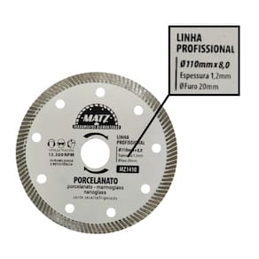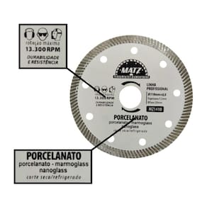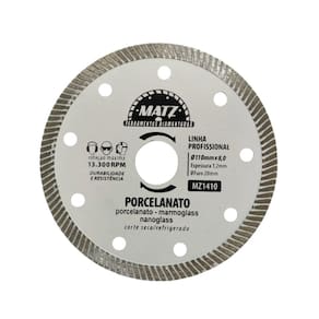 Disco de corte turbo diamantado para porcelanato, ideal para cortes precisos a seco e refrigerado. Seu design turbo garante cortes rápidos e sem lascas, oferecendo alta durabilidade e acabamento impecável. Perfeito para aplicações em porcelanato, combinando praticidade e desempenho em diferentes ferramentas. Informações técnicas: Perfil do corte: Turbo Diamantado Tipo de corte: A seco e refrigerado Dimensões: - Diâmetro externo: 110mm 4.3/8'' - Diâmetro do furo: 20mm - Perfil de corte: 8mm - Espessura: 1,2mm Rotação máxima por minuto RPM : 13.300 - 80m/s Para corte de: Porcelanato, marmoglass e nanoglass Proporciona qualidade e produtividade na operação Produto de altíssima qualidade com alta performance Marca: Não Informado Ean: 7898659064770