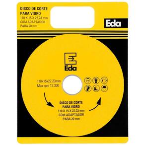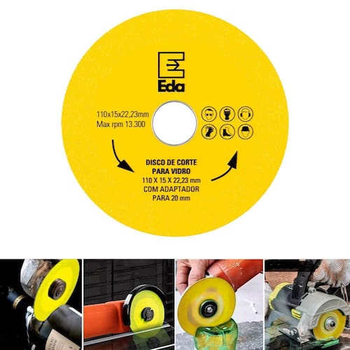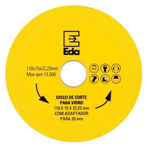Disco de Corte 110mm para Vidro Cerâmica Porcelanato Eda Profissional - Marca: Eda Profissional - Referência: 0TT - Diâmetro: 110mm - Espessura da camada diamantada: 15mm - Espessura: 1mm - Furo: 22,23mm - Acompanha adaptador para furo de 20mm - Velocidade máxima: 13.300rpm - para corte suave, chanfradura e polimento de vidro, espelho, jade, cristal, garrafas de vidro, cerâmica, azulejos cerâmicos e outros materiais - Não corta vidro temperado - Materiais de alta qualidade, feito de partículas abrasivas de diamante muito finas e uniformes - Lâmina com excelente desempenho de corte e baixo ruído de moagem - Menos poeira, menos detritos, mais conveniente, vida útil mais segura e mais longa. - Corte rápido e preciso. - A lâmina de corte de diamante é resistente a alta temperatura, o que pode reduzir a vibração e cortar mais reto e mais rápido - Peso bruto: 100 gramas - : 90 dias Marca: Não Informado Ean: 7895315021238