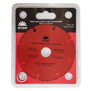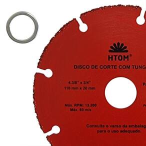 - Marca: HTOM - Referência: HTOM-41407 - Diâmetro: 110mm 4 1/2 - Furo: 20mm - Acompanha anel redutor para 16mm - Disco de Tungstênio para corte em madeira - Para cortar madeira dura, macia, placas de compensado, aglomerado, materiais de fibra como MDF, MDP e piso laminado. - Único modelo de disco de corte seguro para cortar madeira com serra mármore Makita - Uso em serras mármores de qualquer marca: Makita, Bosch, Dewalt, etc. - Mais Durabilidade e melhor acabamento Disco de tungstênio para corte de madeira - Rotação máxima 13.200 rpm 80 m/x - Não deforma nem trava no material, permitindo excelente refrigeração, segurança e durabilidade - Peso bruto: 90 gramas - Garantia: 90 dias