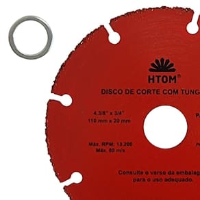 Disco de Corte 110mm Tungstênio para Madeira Uso em Serra Mármore HTOM Único modelo de disco de corte seguro para cortar madeira com serra mármore Makita . Para cortar madeira dura, macia, placas de compensado, aglomerado, materiais de fibra como MDF, MDP e piso laminado, - Marca: HTOM - Referência: HTOM-41407 - Diâmetro: 110mm 4 1/2 - Furo: 20mm - Acompanha anel para 16mm - Disco de Tungstênio para corte em madeira - Para cortar madeira dura, macia, placas de compensado, aglomerado, materiais de fibra como MDF, MDP e piso laminado. - Único modelo de disco de corte seguro para cortar madeira com serra mármore Makita - Uso em serras mármores de qualquer marca: Makita, Bosch, Dewalt, etc. - Mais Durabilidade e melhor acabamento Disco de tungstênio para corte de madeira - Rotação máxima 13.200 rpm 80 m/x - Não deforma nem trava no material, permitindo excelente refrigeração, segurança e durabilidade - Peso bruto: 90 gramas - : 90 dias Marca: Não Informado Ean: 7898452027705