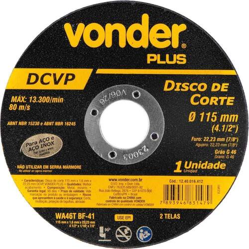Cod. Do Fornecedor: 1240016412 Marca: Vonder Plus Conteúdo da embalagem: 1 Disco de corte 115mm x 16mm x 2223mm DCVP Vonder Plus Proporciona cortes rápidos e menor geração de calor e rebarbas. Indicado para cortar aços e suas ligas, inclusive aço inox. Ideal para operações de corte que necessitam excelente acabamento corte fino . Não utilizar em serra mármore. legal: 90 dias Detalhes Técnicos Modelo: DCV Diâmetro do disco de corte: 115 mm 4.1/2 Espessura: 1,6 mm +/-3/64 Tipo de disco: WA46T BF-41 Diâmetro do furo: 22,23 mm 7/8 Grão: Grão 46 Número de telas do disco: 2 Rotação máxima do disco rpm : 13.300/min Segue norma s : ABNT NBR 15230 e ABNT NBR 16245 Massa aproximada peso : 0.035 kg Marca: Não Informado
