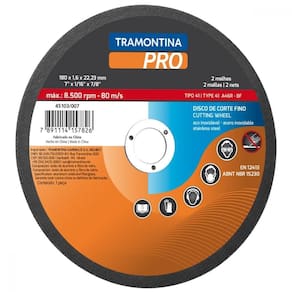 Disco produzido em óxido de alumínio;Corpo reforçado com 2 malhas de fibra de vidro;Anel interno de aço especial;Velocidade máxima de trabalho 80m/s - 13300 rpm;Modelo tipo 41 - A60T-BFEN12413ABNT NBR 15230Utilizado juntamente com esmerilhadeiras nos trabalhos de corte em aços e metais ferrosos em geral.Proporciona um excelente rendimento nas operações de corte;Todas as ferramentas são produzidas e testadas conforme normas específicas. Utilizado no corte de aços e metais ferrosos em geral, a linha de discos de corte da Tramontina PRO é produzida e testada para garantir segurança e resistência. A ferramenta certa para você que trabalha em manutenções industriais.
