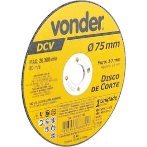 Marca: VonderConteúdo da Embalagem:1 Disco de corteDestaques e diferenciais:Proporciona cortes rápidos e menor geração de calor e rebarbasAplicações e dicas de uso:Indicado para corte de metais, inclusive aço inox. Utilizado em cortadores pneumáticos. Não utilizar em serra mármore.Características Técnicas:Diâmetro do disco de corte: 75 mm Espessura do disco de corte: 1,4 mm - +/- 1/16 Diâmetro do furo do disco de corte: 10 mm Marca: Não Informado