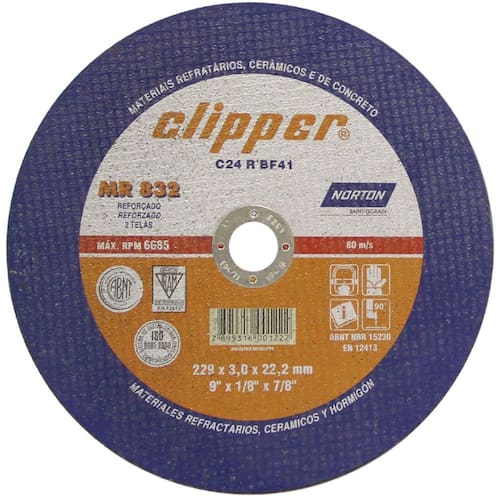 Disco de Corte Clipper MR832 9X1/8X7/8- 0294321- NORTON Descrição: Os Discos de Corte Clipper são indicados para cortes de refratários, ferro fundido cinzento, concreto, granitos, mármores e metais não-ferrosos nas diversas operações da construção civil. Características: - Alto desempenho em materiais não ferrosos em geral - Máquina para utilização: Esmerilhadeira - Superfície para aplicação: Ferro fundido cinzento, mármores, refratários, concreto, granitos e metais não-ferrosos em geral - RPM: 8500 - Operação: Corte Características do disco de 4.1/2: - Alto desempenho em materiais não ferrosos em geral - Diâmetro do disco: 115mm - Espessura: 3.0mm - Diâmetro do furo: 22.23mm - Diâmetro do disco: 4.1/2 - Espessura: 1/8 - Diâmetro do furo: 7/8 - Máquina para utilização: Esmerilhadeira - Superfície para aplicação: Ferro fundido cinzento, mármores, refratários, concreto, granitos e metais não-ferrosos em geral - RPM: 13300 - Operação: Corte Características do disco de 7: - Alto desempenho em materiais não ferrosos em geral - Diâmetro do disco: 180mm - Espessura: 3.0mm - Diâmetro do furo: 22.23mm - Diâmetro do disco: 7 - Espessura: 1/8 - Diâmetro do furo: 7/8 - Máquina para utilização: Esmerilhadeira - Superfície para aplicação: Ferro fundido cinzento, mármores, refratários, concreto, granitos e metais não-ferrosos em geral - RPM: 8500 - Operação: Corte Características do disco de 9: - Alto desempenho em materiais não ferrosos em geral - Diâmetro do disco: 230mm - Espessura: 3.0mm - Diâmetro do furo: 22.23mm - Diâmetro do disco: 9 - Espessura: 1/8 - Diâmetro do furo: 7/8 - Máquina para utilização: Esmerilhadeira - Superfície para aplicação: Ferro fundido cinzento, mármores, refratários, concreto, granitos e metais não-ferrosos em geral - RPM: 6650 - Operação: Corte * Imagens meramente ilustrativas
