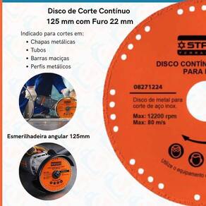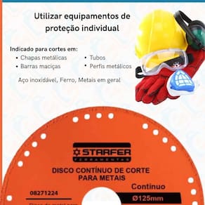 Descrição do Produto O Disco de Corte Contínuo Diamantado Starfer 125 mm é indicado para cortes precisos em metais, proporcionando acabamento fino, menor geração de resíduos e alta durabilidade. Possui borda contínua com grãos diamantados de alta resistência, garantindo maior rendimento e desempenho superior em comparação aos discos abrasivos convencionais.