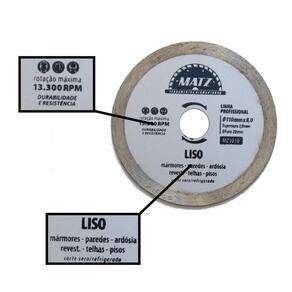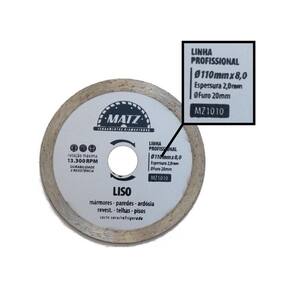 Informações técnicas: Perfil do corte: Liso Diamantado Tipo de corte: A seco e refrigerado Dimensões: - Diâmetro externo: 110mm 4.3/8'' - Diâmetro do furo: 20mm - Perfil de corte: 8mm - Espessura: 2mm Rotação máxima por minuto RPM : 13.330 - 80m/s Para corte de: Mármores, paredes, ardósia, revestimentos, telhas e pisos Proporciona qualidade e produtividade na operação Produto de altíssima qualidade com alta performance