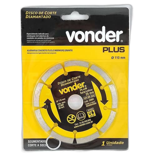 Disco De Corte Diamantado Segmentado Seco Plus 110mm - Vonder O disco de corte diamantado plus vonder proporciona qualidade e produtividade na operação. Informações técnicas: - Modelo: NL - Perfil do corte: Segmentado - Tipo de corte do disco de corte diamantado: A seco - Diâmetro externo do disco de corte diamantado: 110 mm - Diâmetro do furo do disco de corte diamantado: 20,0 mm - Altura do segmento diamantado: 7 mm - Espessura do segmento diamantado: 1,8 mm - Rotação máxima: 14.000/min - Massa aproximada peso : 0.115 kg - Segue norma: ABNT NBR 15545 - : 90 dias Instruções: - Indicado para cortar mármore, granito, tijolo, concreto, entre outros. - Utilizado na construção civil para abertura de canaletas em paredes de alvenaria. - Os discos de corte a seco, quando refrigerados, proporcionam melhor rendimento. Conteúdo da embalagem: - 1 Disco de corte diamantado plus 110mm - 1 Bucha de redução de 20 mm para 16 mm