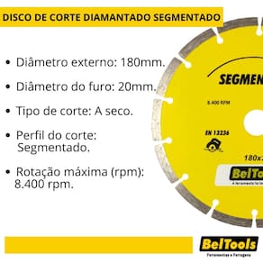 Diâmetro externo: 180mm. Diâmetro do furo: 20mm. Tipo de corte: A seco. Perfil do corte: Segmentado. Rotação máxima (rpm): 8.400 rpm.