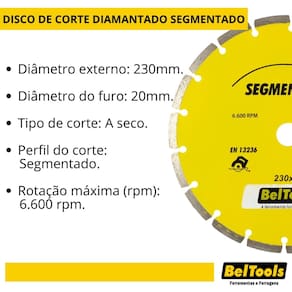 Diâmetro externo: 230mm. Diâmetro do furo: 20mm. Tipo de corte: A seco. Perfil do corte: Segmentado. Rotação máxima (rpm): 6.600 rpm.
