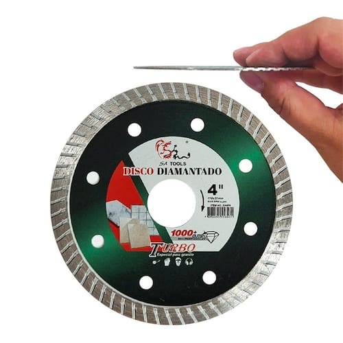 - marca: sa tools - modelo: sa859 - diâmetro: 110m 4 polegadas - espessura:1mm - furo de 22mm - acompanha anel redutor de furo para 20mm - rotação máxima 15. 000 rpm - disco diamantado turbo extra fino de alto rendimento - uso em serras mármore: makita, bosch, dewalt, e outras marcas. - pode ser utilizado seco ou com água - para uso em mármore, granito, cerâmica, azulejo, piso e concreto. - também indicado para porcelanatos, vidros, nanoglass, marmoglass, espelhos e mármores importados. - não corta vidros temperados