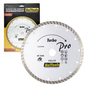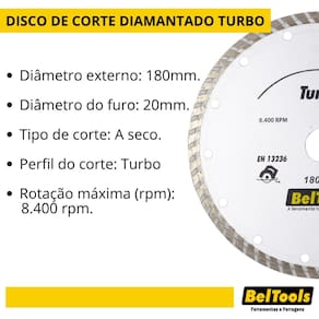 Diâmetro externo: 180mm. Diâmetro do furo: 20mm. Tipo de corte: A seco. Perfil do corte: Turbo. Rotação máxima (rpm): 8.400 rpm.