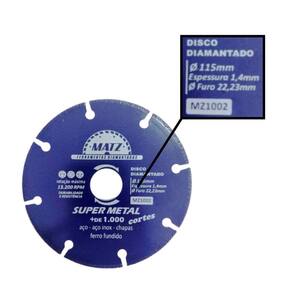 Informações técnicas: Tipo de corte: A seco e refrigerado Dimensões: - Diâmetro externo: 115mm 4.1/2'' - Diâmetro do furo: 22,23mm 7/8'' - Acompanha anel de redução para 20mm - Espessura: 1,4mm Rotação máxima por minuto: 13.200 - 80m/s Para corte de: Aço, aço inox, chapas e ferro fundido Proporciona qualidade e produtividade na operação Produto de altíssima qualidade com alta performance