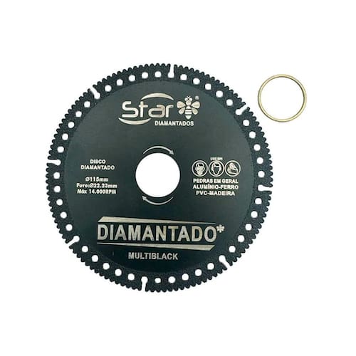 Marca star. Disco de corte multiblack 115mm de diâmetro com furo de 22,23mm de diâmetro acompanha anel de redução para reduzir o diâmetro de 22,23mm para 20mm . Rotação máxima: 14.000rpm. Disco de corte para aplicação em pedras em geral, alumínio-ferro, pvc, borracha e madeira. Marca: Não Informado