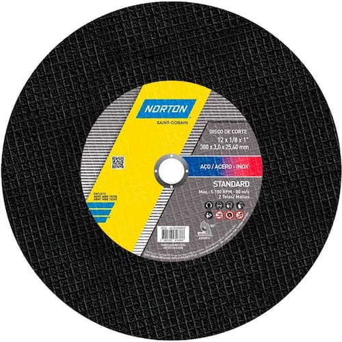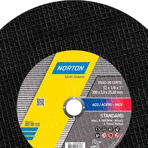 Produto: Disco de corte para metal e inox 12" x 1" x 3 mm - Standard Marca: Norton Descrição: O Disco de Corte para Metal e Inox 12" x 1" x 3 mm da Norton Standard é um acessório essencial para trabalhos de corte em metais. O Disco de Corte Norton foi projetado para excelência em operações de corte em aço carbono e inox. Seja para trabalhar com tubos, chapas, barras ou qualquer outro material robusto, este disco garante cortes precisos e rápidos, optimizando seu tempo e aumentando sua eficiência no trabalho. O Disco Standard confere não apenas performance superior, mas também segurança e durabilidade. Fabricado com materiais de alta qualidade, o disco de corte da Norton é a escolha perfeita para quem busca resultados profissionais em metalurgia e serralheria. • Tamanho ideal: Com um diâmetro de 12" e espessura de 3 mm, é ideal para cortes robustos e detalhados. • Material específico: Desenvolvido especialmente para aço carbono e aço inox, proporcionando cortes sem rebarbas e com menos faíscas. • Design otimizado: Oferece menor geração de calor durante o corte, minimizando o desgaste do material e do próprio disco. • Marca de confiança: Norton é um nome consolidado no mercado, sinônimo de qualidade e inovação em abrasivos. • Indicações de uso: Ideal para operações de baixa severidade, permitindo cortes rápidos sem comprometer a qualidade.Especificações: Diâmetro: 12” 300 mm Diâmetro do furo: 1” 25,4mm Espessura: 1/8” 3mm 2 TelasRotação máxima: 5.100 rpm / 80m/s.