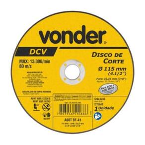 - Marca: Vonder; - Referência: 12.40.412.100; - Modelo: DCV; - Tipo de disco: Tipo 41; - Grão: G 60; - Número de telas do disco: 2; - Rotação máxima do disco (rpm): 13.300/min; - Ideal para operações de corte que necessitam excelente acabamento (corte fino); - Para manutenções e reparos leves; - Não utilizar em serra mármore; - Segue norma(s): ABNT NBR 15230 e ABNT NBR 16245; - Garantia legal: 90 dias.