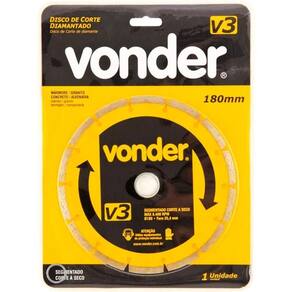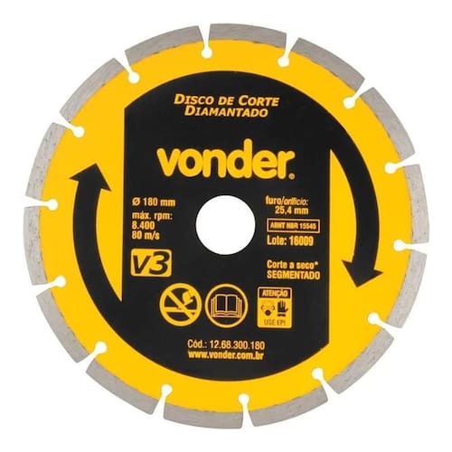 Proporciona qualidade, produtividade e maior profundidade de corte.Características do produto:- marca: vonder;- modelo: v3;- perfil do corte: segmentado;- tipo de corte do disco de corte diamantado: a seco;- rotação máxima: 8.400/min;- indicado para cortar mármore, granito, concreto, tijolo, telhas, alvenarias e pedras;- : 3 meses.Dimensões do produto:- espessura do segmento diamantado: 2,2mm;- altura do segmento diamantado: 7mm;- diâmetro do furo do disco de corte diamantado: 25,4mm;- diâmetro externo do disco de corte diamantado: 180mm.Imagens meramente ilustrativas, os objetos que ambientam as imagens não acompanham o produto Marca: Não Informado Ean: 7893946169510