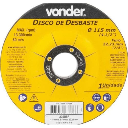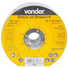 Conteúdo da Embalagem: 1 Disco de desbaste Indicado para trabalhos leves de desbaste em metais ferrosos com esmerilhadeiras angulares. Possui excelente performance em trabalhos intermitentes. Diâmetro externo do disco de desbaste:115 mm - 4.1/2 Espessura do disco de desbaste:6,4 mm - +/- 1/4 Número de telas do disco:3 Diâmetro do furo do disco de desbaste:22,23 mm - 7/8 Rotação máxima do disco rpm :13.300/min Norma de referência:ABNT NBR 15635 / ABNT NBR 16195 - E CDC : legal: 90 dias Marca: Não Informado