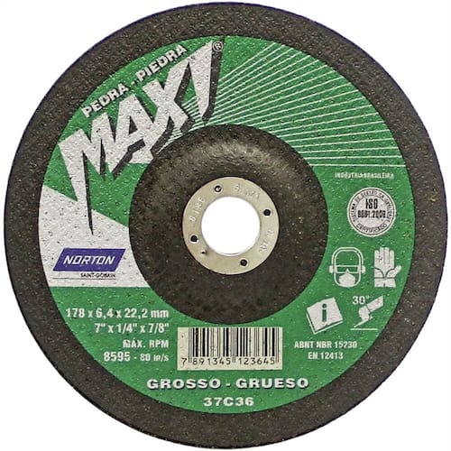 Disco de desbaste com 180mm de diâmetro externo, 22.23mm de diâmetro interno e 6.4mm de espessura. Indicado para aplicação em mármores, granitos e pedras em geral. Os discos são produzidos com as mais atualizadas tecnologias de produto e processo, possui a marca de segurança ABNT e conta com a certificação ISO 9001:2008. Tem também as certificações ISO 14001 e OHSAS 18001, no que se refere a conformidade com os requisitos ambientais, saúde e segurança do trabalho, respectivamente.
