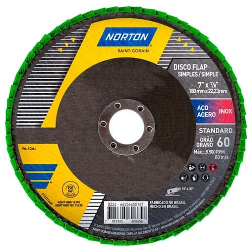 Produto: Disco de lixa flap disc côncavo 7" fibra - Standard Marca: Norton Grão: 60Descrição: O Disco de Lixa Flap Disc Côncavo 4.1/2" da Norton foi especiamente projetado para oferecer uma experiência superior em desbaste e preparação de superfícies, ideal para profissionais exigentes. Composto por aletas de lixa duráveis com costado de tecido e grão de óxido de alumínio, o Disco de Lixa Flap Disc Côncavo da Norton se destaca na categoria de entrada por sua performance notável. Se você busca resultados profissionais em manutenção e pequenos reparos, este é o produto que você precisa. Indicações do uso: Ideal para metais, aço carbono, e aço inoxidável. Especialmente desenvolvido para processos como remoção e nivelamento de superfícies, além de preparação para pintura. Alto rendimento, garantindo uma remoção eficaz do material com menos trocas de disco. Design côncavo, que proporciona um contato otimizado com a superfície de trabalho, aumentando a uniformidade e a qualidade do acabamento.Especificações: Medida: 7 " 180mm Diâmetro do furo: 22,23 mmCostado em fibraFormato: cônico.