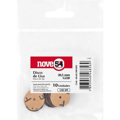 Disco De Lixa Para Microrretífica 20,5Mm G220 10 Peças Nove54 Marca: Nove54Conteúdo da Embalagem:1 Pacote com 10 discos de lixaAplicações e dicas de uso:Utilizado em microrretíficas para lixamentos e acabamentosCaracterísticas Técnicas:Diâmetro do disco: 20,5 Diâmetro do furo do disco: 2,00 mm Grão: G 220
