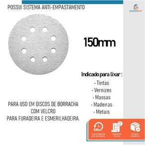 O disco de lixa é ideal para se usar com discos de borracha, furadeira e esmerilhadeira. Produzido em lixa abrasiva com pluma é indicado para lixar massa, tintas, vernizes, metais e madeira. Características técnicas: material: resina, óxido de alumínio, papel e pluma. Medidas: 150mm 6 quantidade de furos: 8 limite máxima: 8500rpm, 80m/s grão: 400 marca: starfer ref. : 4003691