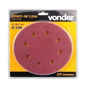Disco ideal para lixar paredes de alvenaria, gesso e massa corrida. Possui sistema fixa fácil e 8 furos para aspiração da poeira. Indicado para lixadeira de parede LPV 750.- Diâmetro do disco: 7 - 225mm- Grão: G240- Tipo de grão abrasivo: Óxido de alumínio- Acompanha: 10 unidades--------------------- BIG BOOST ------------------------Disco De Lixa Com Grão 240 Para A Lixadeira Lpv 750 VonderPossui sistema fixa fácil e 8 furos para aspiração da poeira Itens Inclusos: 1 Pacote com 10 discos de lixa Altura: 9 cm Largura: 68 cm Profundidade: 80 cm Informações Adicionais: Possui sistema fixa fácil e 8 furos para aspiração da poeira Informações Complementares: Diâmetro do disco de lixa: 7' - 225mm / Grão: G 240/ Tipo de grão abrasivo: Óxido de alumínio Itens Estampados: 1 Pacote com 10 discos de lixa Peso: 0.185 Recomendações de Uso, Manutenção e Limpeza: Ideal para lixar paredes de alvenaria, gesso e massa corrida. Indicado para a Lixadeira de Parede LPV 750 VONDER.Caracteristicas gerais: Grão=240