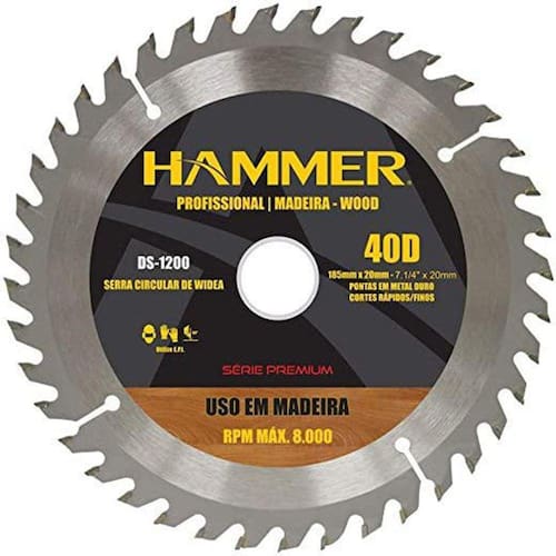 Disco de serra circular 40 dentes 7 Hammer Produto: Disco de serra para madeira 7.1/4 x 40 mm 40 dentes Marca: Hammer Descrição: O Disco de serra para madeira com 40 dentes da Hammer possui é ideal para cortes de madeira e derivados Disco com dentes de vídea (metal duro) Rotação máxima de 13.000 rpm. Especificações: Diâmetro: 7.1/4 (185mm) Furo: 20 mm Dentes: 40 Rotaçao max. 13.000.
