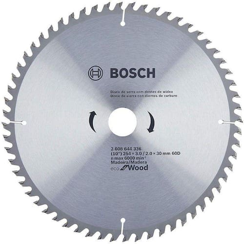 Disco De Serra Circular Bosch Eco D 254X60TDisco de serra circular ecoline wood 10 60 dentes bosch O disco de serra circular eco for wood é a melhor escolha para cortes seguros em madeira. Os dentes totalmente afiados oferecem corte suave sem esforço. Além disso, estes dentes bem selecionados garantem uma boa vida útil. O processo de produção cuidadosamente controlado permite que este disco de serra circular satisfaça os padrões de qualidades bosch. O disco destina-se ao corte de peças de madeira macia, madeira dura, compensado e mdf para o tamanho desejado. É compatível com serras manuais e de bancada.Especificações: Modelo: 2608644336Diâmetro externo mm : 254mmDiâmetro do furo mm : 30mmNumero de dentes: 60Largura do corte/espessura da base mm : 2mmRpm máximo: 6.000Material: aço e carbeto de tungstênioItens inclusos na embalagem:1 disco de serra circular ecoline 254, furo de 30 mm, espessura de 2 mm, 60 dentes, 1 anel de redução 30-25mm.