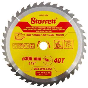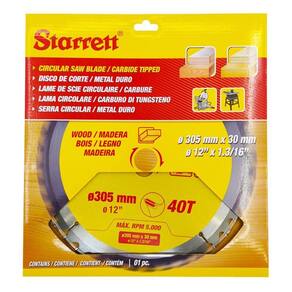 Modelo: Serra Circular Metal Duro. Aplicação: Madeira. Diâmetro Externo mm : 305. Diâmetro do Furo mm : 30,00. Dentição: 40. Rotação RPM : 5.000. Aplicação: Projetada para uso na construção civil, marcenaria, carpintaria, indústria moveleira.